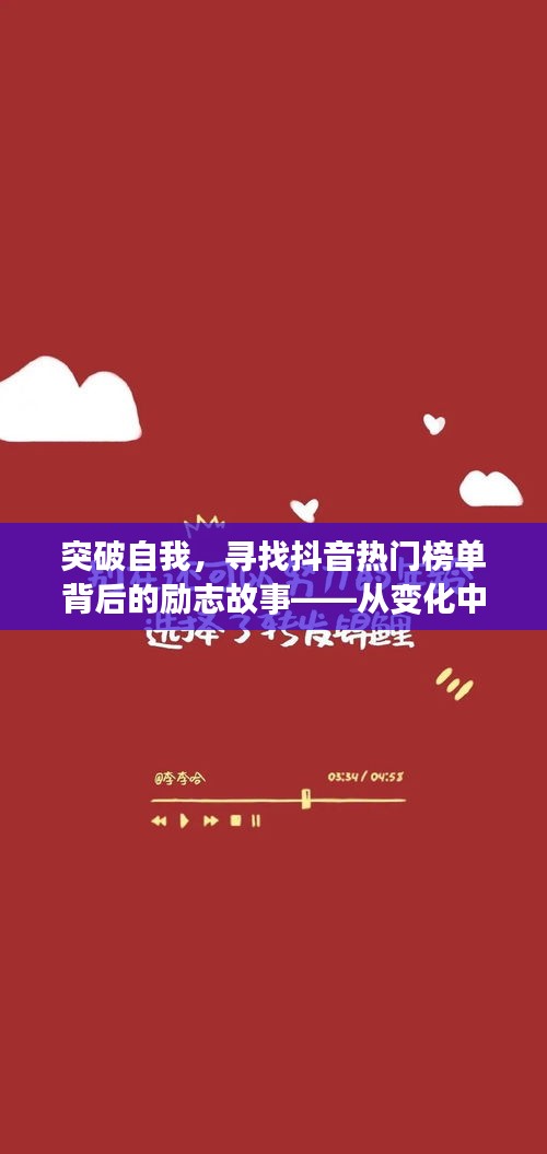 摘要:突破自我,探寻抖音热门榜单背后的励志故事,这些故事充满正能量,鼓舞人心。通过不断尝试和努力,人们在变化中找寻自信与成就感,挑战自我,突破局限。这些故事展示了人们在面对挑战时的坚韧和毅力,以及通过努力和毅力实现梦想的决心。这些故事激励着更多人勇敢追求自己的梦想,不断突破自我,实现个人价值的最大化。